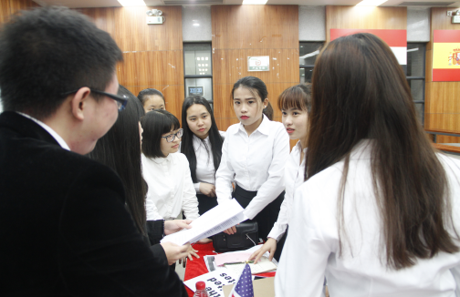 本次活动经过了4个多星期的精心筹备,由辅导员袁瑜英老师对参赛选手就模联相关知识与技能进行了全方位培训,学术准备充足,流程正规严谨。大会严格按照联合国官方议事规则安排进程,包含开幕视频播放(模联历史地位及叙利亚危机背景简介)、到场国点名、发言名单确定、立场演说、正式辩论与非正式辩论、决议草案的修改与表决等环节。