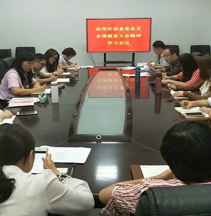 2018年10月23日下午,应用外语系党总支在8A107召开党员大会学习习近平总书记在全国教育大会上的重要讲话,会议由党总支书记金海兵同志主持。