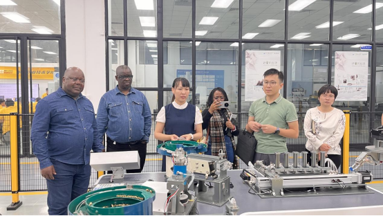 来宾一行先后参观了我校机器人技术平台、智能终端测试与制造实践中心和数字化智造工厂。参观过程中,电子信息学院刘洋、范启亮老师以及智能制造学院陈妹琼老师分别从实训条件建设、课程体系设置和理实一体化教学模式等方面进行了介绍。我校完善的实训条件、系统的课程设计以及丰富的涉外培训经验,得到了来访嘉宾一致认可。